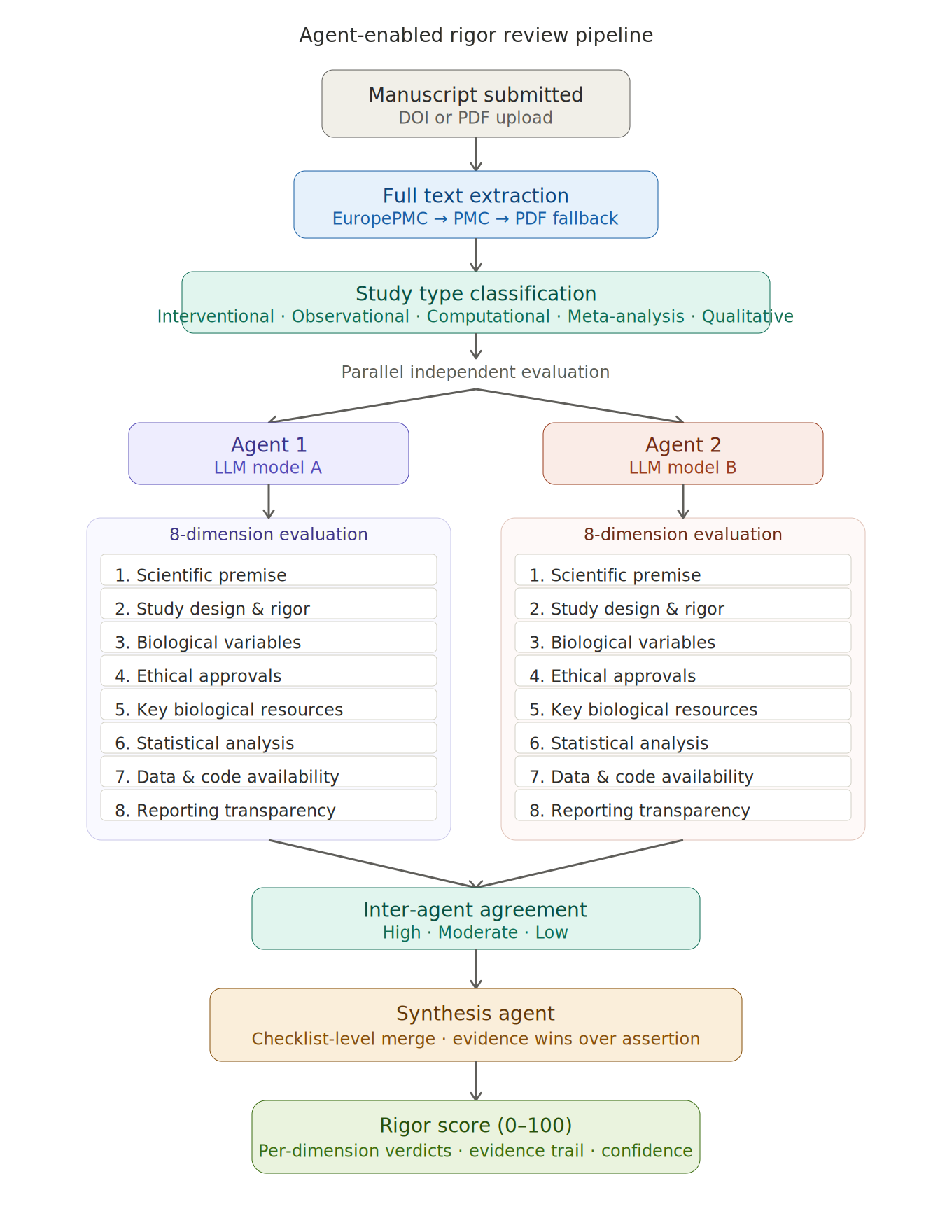 Parallel dual-agent evaluation. Two independent AI agents, running different foundation models, each evaluate the manuscript across eight dimensions derived from the NIH rigor and reproducibility framework, the MDAR checklist, ARRIVE 2.0, CONSORT, the RRID Initiative, and the SciScore/RTI criteria developed by Menke et al. The eight dimensions are: